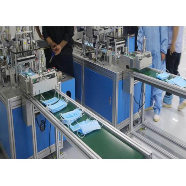 This machine is mainly used for automatic forming of N95 cup face masks. After the entire roll of fabric is unrolled, it is driven by rollers,and the fabric is automatically folded and wrapped. Nose bridge rolls unrolled by traction. Cut and import into the hemmed fabric,both sides are welded to seal by ultrasonic welding, and then through the ultrasonic side seal. It is cut and shaped by a cutter;transported to the two mask ear band welding stations through an assembly line. The final mask is formed by ultrasonic welding.After the mask is made, it is transported to flat belt line and collected.